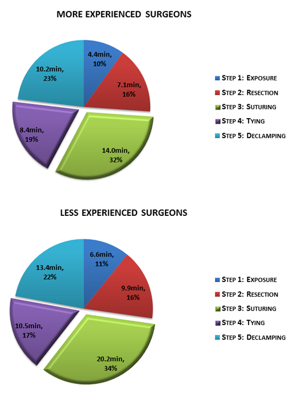 Figure 4 Comparison between less and more experienced surgeons in distribution of the five steps of aortic cross-clamp time.