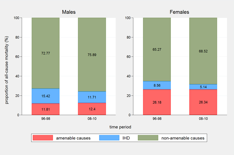 However, between 1996–1998 and 2008–2010 the proportion of all-cause mortality attributed to amenable causes remained stable in both sexes (around 12% in males and 26% in females) with a 2.2-fold higher proportion of amenable deaths in females (fig. 2). The proportion of IHD mortality decreased from 15.4 to 11.7% in males and from 8.6 to 5.1% in females. The proportion of deaths attributed to non-amenable causes increased slightly from 72.8 to 75.9% in males and from 65.3 to 68.5% in females.