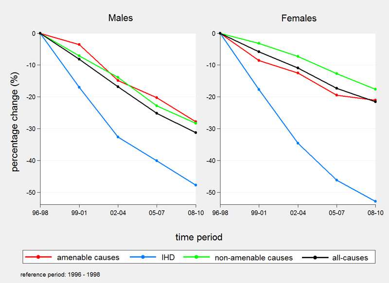 Figure 1 Percentage changes in 3-year age-standardised mortality rates (European standard [32]), age 0–74 years: amenable causes, ischaemic heart diseases (IHD), non-amenable causes and all causes by sex for the population of Switzerland, time period 1996–2010.