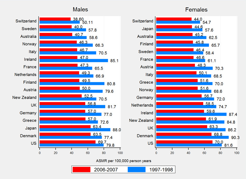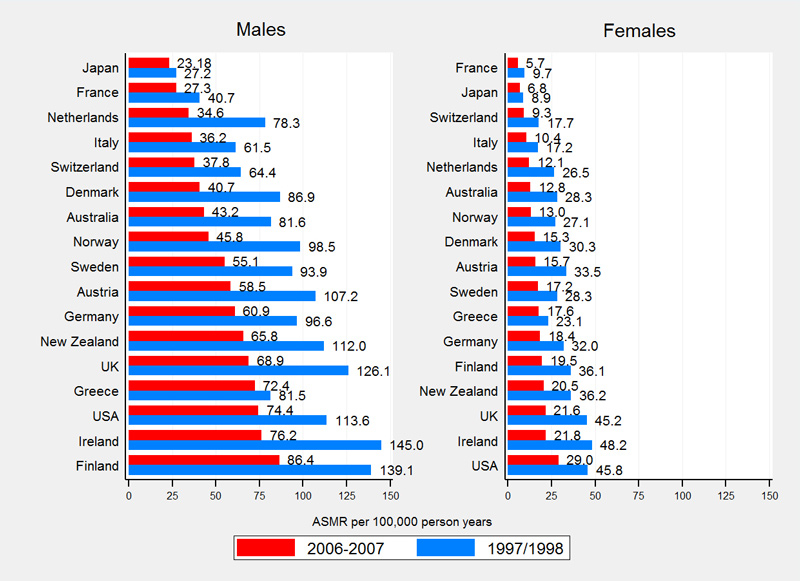 Figure 4 Age standardised mortality rates (ASMR) (European standard [32]) per 100 000 person-years for ischaemic heart disease (IHD) by sex for the population of 17 high-income countries, age 0–74 years, time periods 1997/1998 and 2006/2007.