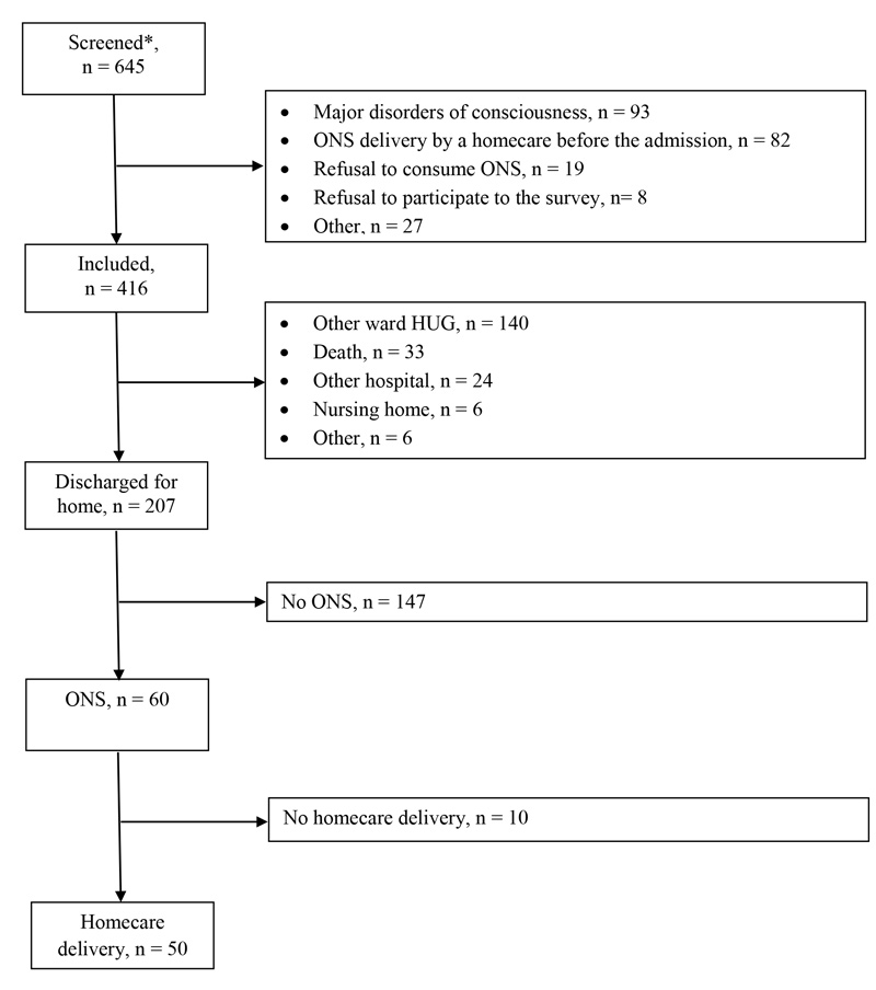 Out of 645 screened patients, 416 were included (64.5%) ( fig. 1 ). The main reasons for exclusion were major disorders of consciousness (41.9%, n = 93), and ONS delivery by a homecare provider before the admission (35.8%, n = 82).