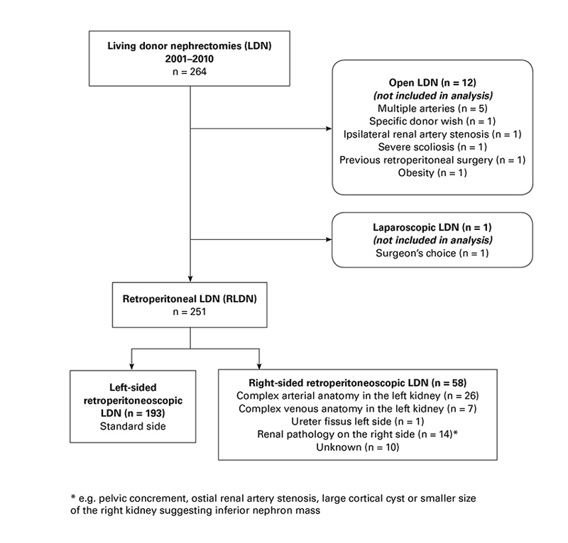 Donors and recipients were evaluated prior to transplantation according to a protocol including the risks after donation for the donor, immunological and anatomical suitability. The choice whether to use the right or left kidney was made at an interdisciplinary meeting involving nephrologists, explant and transplant surgeons. Magnetic resonance (MR) angiography was the standard imaging modality for the preoperative donor work-up and was substituted by computed tomography angiography if MR was not suitable. There was no minimum length of the right renal vein for right retroperitoneoscopic LDN. Reasons for choosing the side of the kidney can be seen in the flow chart presented in figure 1. The policy governing the decision for the choice of side of kidney did not change during the study period. Retroperitoneoscopic LDN was performed as pure retroperitoneoscopic surgery with hand-assistance only for the final stages of vessel transection immediately before removing the kidney. The renal artery and vein were transected over a TA-30 stapler line. Surgery was performed by three dedicated surgeons (two urologists and one general surgeon). Details of the technique of retroperitoneoscopic LDN used have been published earlier [8, 9]. Kidney transplantation was performed via a Gibson incision in the lower abdomen, exposing the external iliac artery, the iliac vein and the bladder. Both arterial and venous anastomoses were performed end-to-side. In the case of multiple arteries or veins, either a common ostium was fashioned between the individual vessels or the individual vessels were anastomosed to the iliac vessels separately. After positioning the kidney in the iliac fossa, the graft ureter was anastomosed to the bladder using the Lich-Gregoire technique and stented with a double-J ureteric stent, which was usually removed after 6-8 weeks.