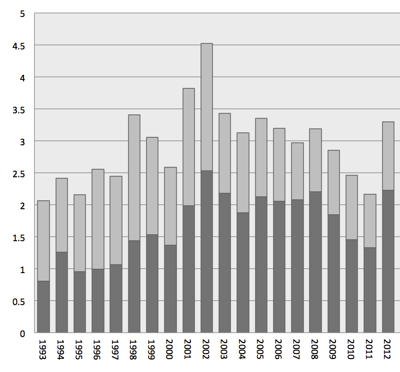 Figure 1 Incidence of MSSA bloodstream infection per 10 000 patient-days from 1993 to 2013.