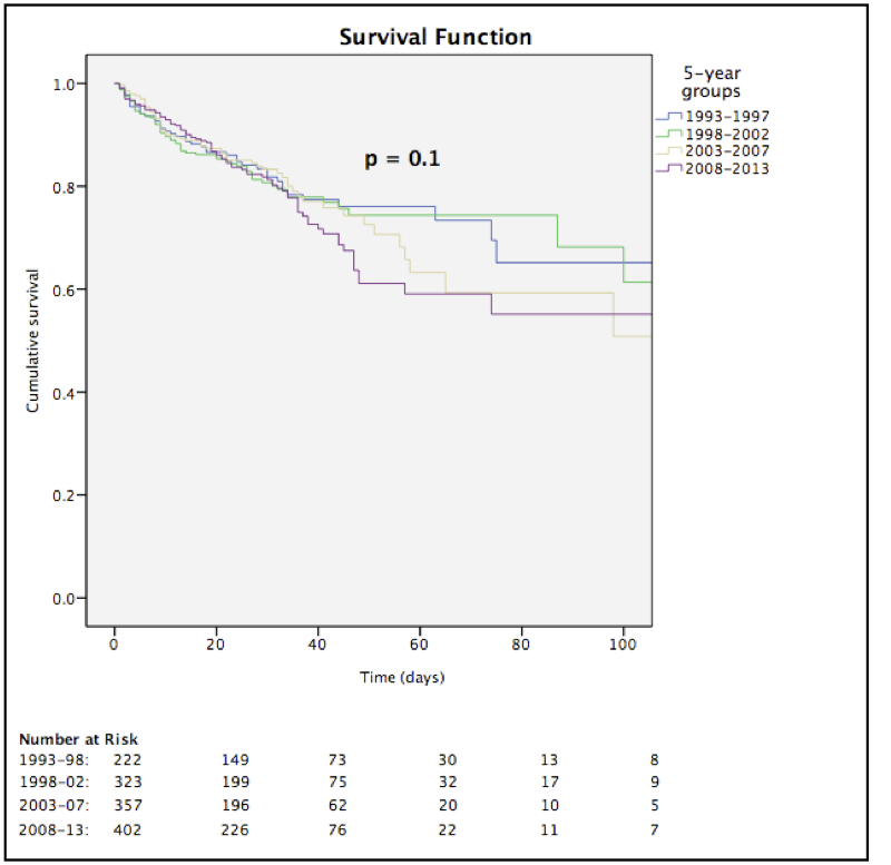 Kaplan-Meier survival-plots and the log-rank test were used to compare survival distributions between the different time periods. Mortality was expressed as in-hospital, all-cause mortality. A p-value of <0.05 was considered significant for all calculations.