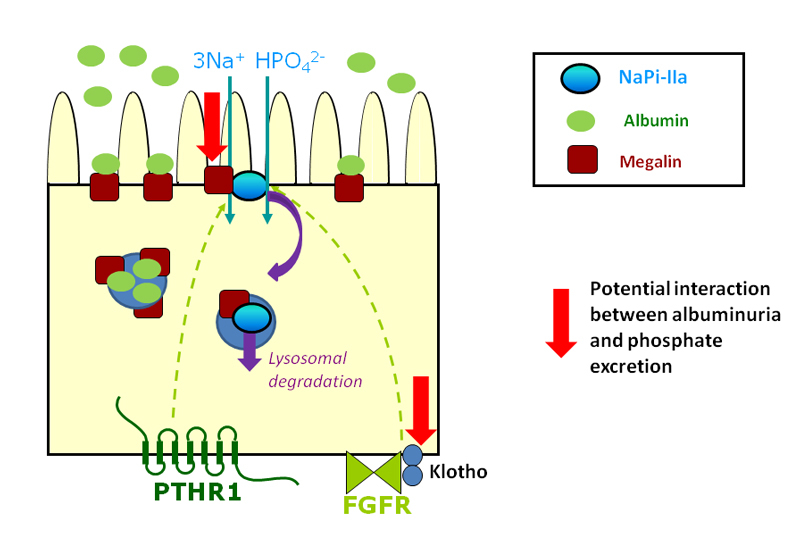 We further studied the molecular mechanisms of these observations in vivo, in two models of proteinuria in the rat and the mouse, as well as in vitro in cultured proximal tubule derived cells. Briefly, we demonstrated that proteinuric animals displayed higher levels of the sodium phosphate transporter NPT2a, despite higher FGF23 and PTH levels. The FGF23 downstream pathway was also down-regulated in the two models of proteinuric animals, suggesting a resistance to FGF23. This was seen together with a decrease in renal Klotho protein expression in both animal models. Finally, in cultured cells, albumin had no apparent direct effect on phosphate transport. These experimental data confirmed a tubular impairment in phosphate excretion in the presence of albuminuria. The absence of albumin effect on cultured cells suggests that this defect does not rely on a direct competitive effect of albumin on phosphate absorption in the proximal tubule. Rather, albuminuria impaired FGF23 downstream pathway, probably due to a decrease in the Klotho protein, a major FGF23 cofactor and a regulator of phosphate excretion.