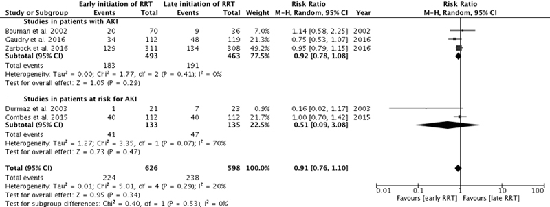 The absence of a mortality benefit in our analysis contrasts with the results of previous meta-analyses that mainly included observational studies [2, 3, 23]. However, observational trials have clear limitations, as patients in the two treatment arms might have been fundamentally different. There is a substantial probability that these studies were impacted by indication bias in which the delayed use of dialysis in sicker or moribund patients accounted for the detected benefits rather than any treatment effect. Notably, there was significant heterogeneity among the included trials. Study design seems to be the most important factor underlying this heterogeneity. Older trials used different arbitrarily selected cut-offs in urea or creatinine levels to assign patients to the early RRT group, whereas most recent studies offered RRT in the next few hours post randomization in all patients in the early group. When only trials with this design were included in the analysis, the result was similar but the confidence interval was narrower, suggesting a potential trend towards modestly lower mortality with early RRT. The heterogeneity was significantly lower with I2 dropping from 53 to 0%.