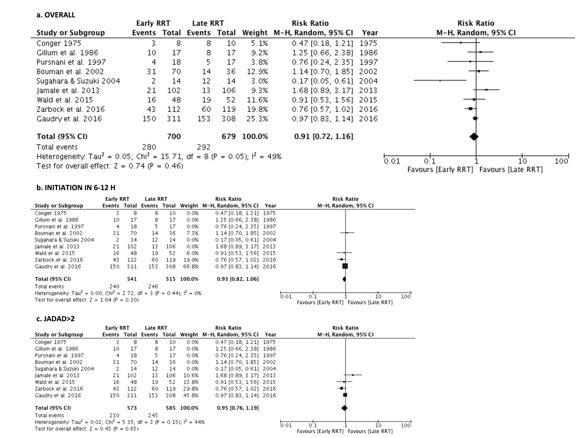Figure 2 Forest plot demonstrating the impact of early renal replacement therapy on in-hospital or 60-day mortality compared with late renal replacement therapy. (a) All studies in patients with acute kidney injury (AKI) were included. (b) Only the trials that offered renal replacement therapy within 6 to 12 hours of eligibility were included. © Only studies with a Jadad score >2 were included. Data are presented as risk ratios with 95% confidence intervals. A random-effects model was used.