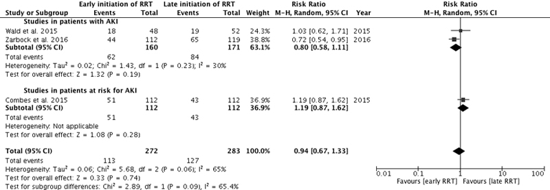 Four randomised controlled trials (RCTs) attempting to address this question have been published over the last 4 years [5–8]. Systematic review and meta-analysis of the larger pool of randomised data now available is needed to provide clarity on the potential benefits and risks of early compared with delayed initiation of RRT in AKI and to provide the information needed to most efficiently plan definitive trials. We therefore conducted a systematic review and meta-analysis of randomised trials to better estimate the effects of early initiation of RRT among patients with AKI compared with late initiation of RRT on short-term mortality as well as other relevant outcomes such as recovery from AKI and infectious complications. We also analysed the impact of preventive dialysis on the same outcomes.