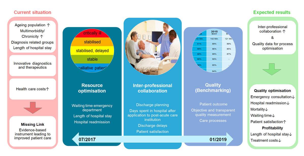 Industrialised healthcare systems are transforming as they seek to improve health outcomes of patient populations and individuals, while reducing the rise in healthcare costs. In Switzerland, one major focus is to identify the most appropriate management setting for the diagnosis and treatment of acute medical conditions in mostly multimorbid inpatients – particularly as it relates to hospital-based care, which accounts for 36% of total Swiss healthcare costs in 2014 [1]. So far, however, most team care interventions have shown ambiguous effects [2]. In regard to communication between patients and physicians, the Swiss healthcare system has reported some promising results [3]. Swiss patients are mostly sufficiently informed about main diagnostic and therapeutic goals, and about treatment alternatives, and receive specific instructions about when and how to seek further care [3, 4]. A mostly evidence-based usage of medication also increases trust between patients and physicians [5, 6]. Nevertheless, there is still room for improvement, particularly in terms of accountability for quality, appropriateness and costs of healthcare services in the complex context of older, multimorbid medical inpatients [7]. To advance this effort, federal, cantonal, and private organisations all require benchmark data from hospitals. Changing policy responsibility for planning and delivery of healthcare services, partial financing of hospitals, and provision of subsidies for insurance premiums, however, makes a national assessment and a consistent steering strategy challenging.