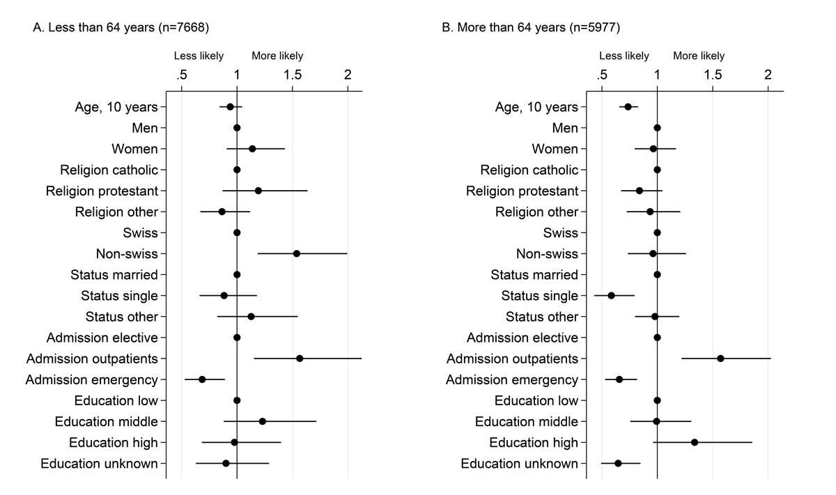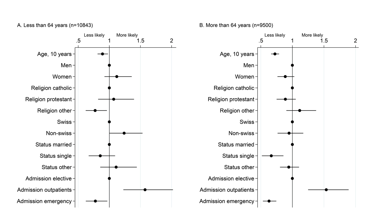 Figure 2 Factors associated with willingness to participate among 25 721 patients. Dots represent odds ratios and bars 95% confidence intervals from a multivariable logistic model including willingness to participate as the dependent variable, run separately in the two age strata. The age cut off at 64 years was chosen as it is close to the median age and happens to closely match the retirement age in Switzerland. Patients aged <64 years are depicted in Panel A, and those aged 64 or older are shown in Panel B.