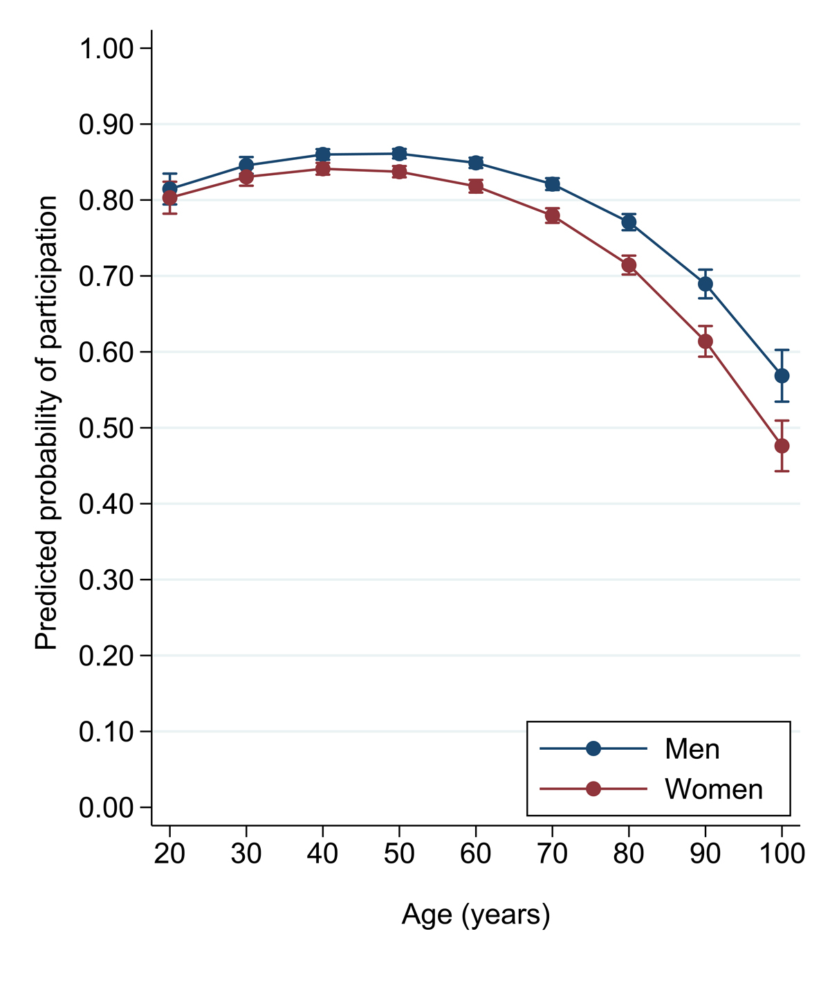 Figure 1 Predicted probability of participation by sex at specific age levels. Dots represent the predicted probability of participation by sex at specific age levels (20 years, 30 years, etc.) generated from a multiple logistic regression model in which the outcome was participation (code is 1 for a participant and 0 for a non-participant) and which included consent place, citizenship, religion and marital status as covariates. The whiskers represent 95% confidence intervals. The age-specific estimated probabilities of participation are depicted in blue for men and in red for women.