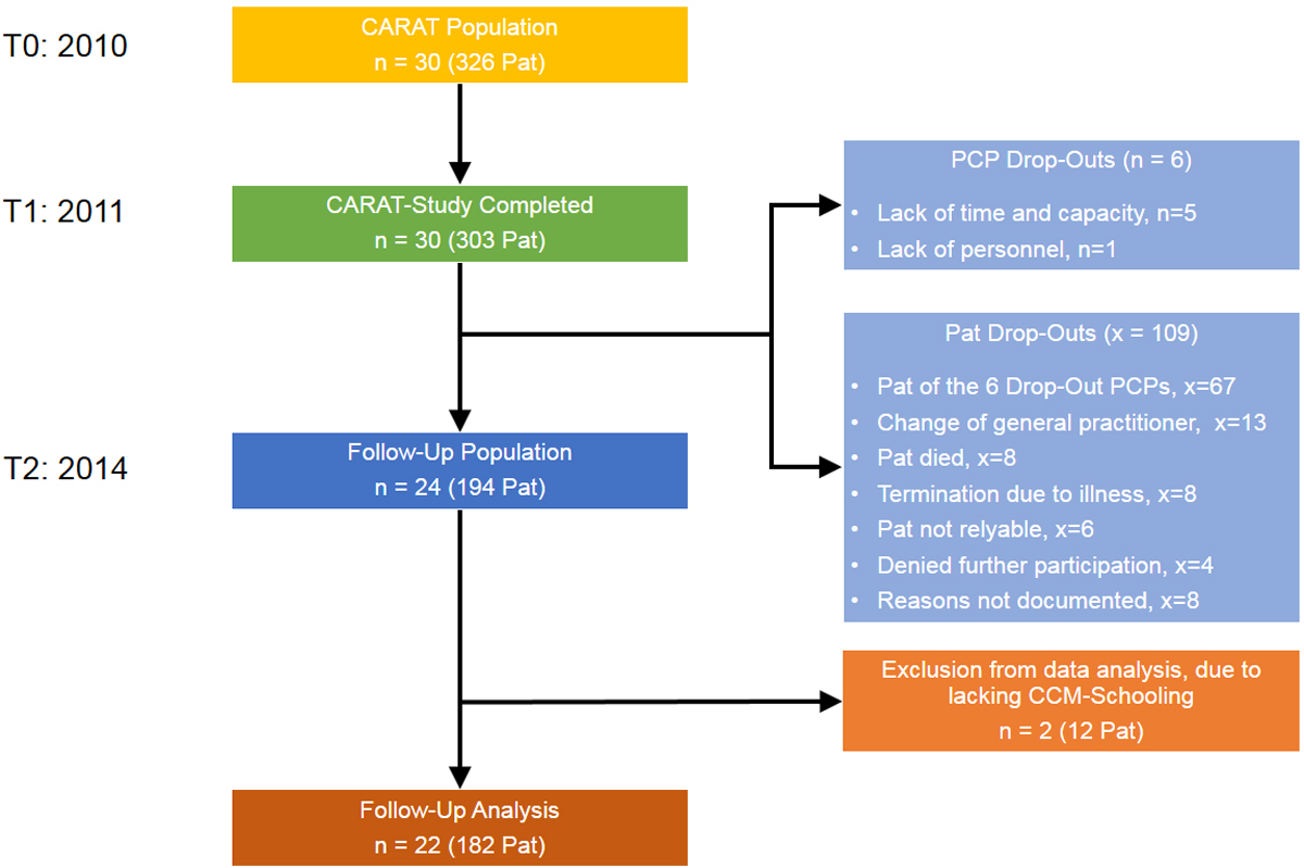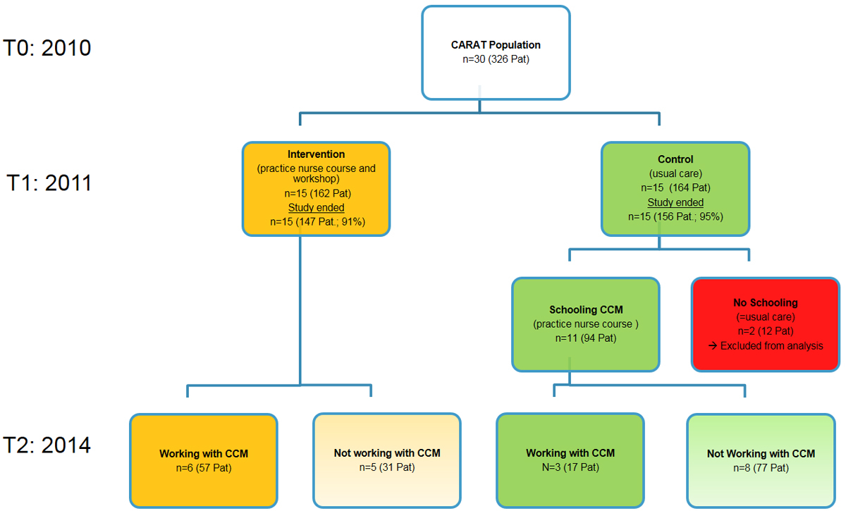 The current follow-up study among the 30 originally participating PCPs of the CARAT trial (303 type 2 diabetes patients) was performed in 2014, 3 years after the end of the trial (T2). Recruitment of participants took place between April and October 2014. After completion of the CARAT trial, the practice nurses of the control group were given the opportunity to participate in the same diabetes management course that the intervention group had participated in. In contrast to the training of the CARAT intervention group, no common workshops were provided for the general practitioners. For the data analysis, we considered all the participating PCPs from the intervention group. Since the focus of the current follow-up was to evaluate the effect of implementing the CCM in the long term, only PCPs from the original control group whose practice nurses had completed the diabetes management course were included. Thirteen of the 15 practice nurses of the control group had participated in the course, two had not. Their data, including the associated 12 patients, could therefore not be taken into consideration for the follow up evaluation.