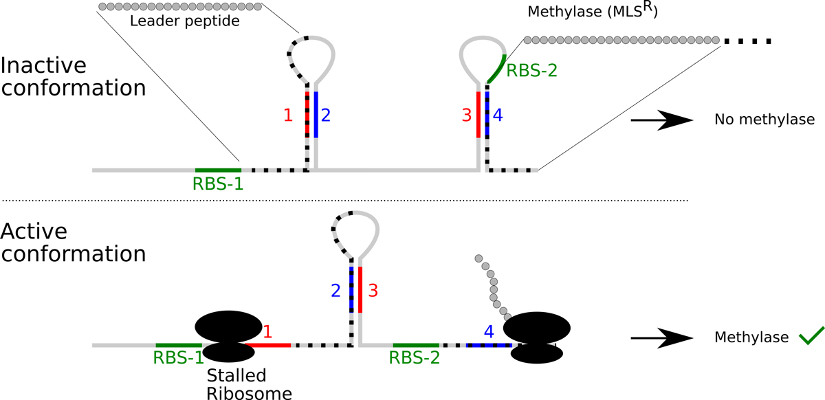 Figure 3 Regulation of macrolide-lincosamide-streptogramin B resistance. Resistance to these antibiotics occurs by methylating the ribosomal RNA to prevent binding of the antibiotic. The expression of the methylase is normally repressed by occluding the RBS in a secondary structure (3•4). In presence of the antibiotic, the translation of an upstream open reading frame will be blocked. This in turn will block the first inverted repeat and thereby allow the formation of the secondary structure 2•3. Since the inverted repeat 3 is already engaged, the inverted repeat 4 is free and the RBS for the methylase remains accessible, allowing expression of the resistance phenotype. Deletions can occur in the regulatory region and lead to constitutive MLS resistance [37].