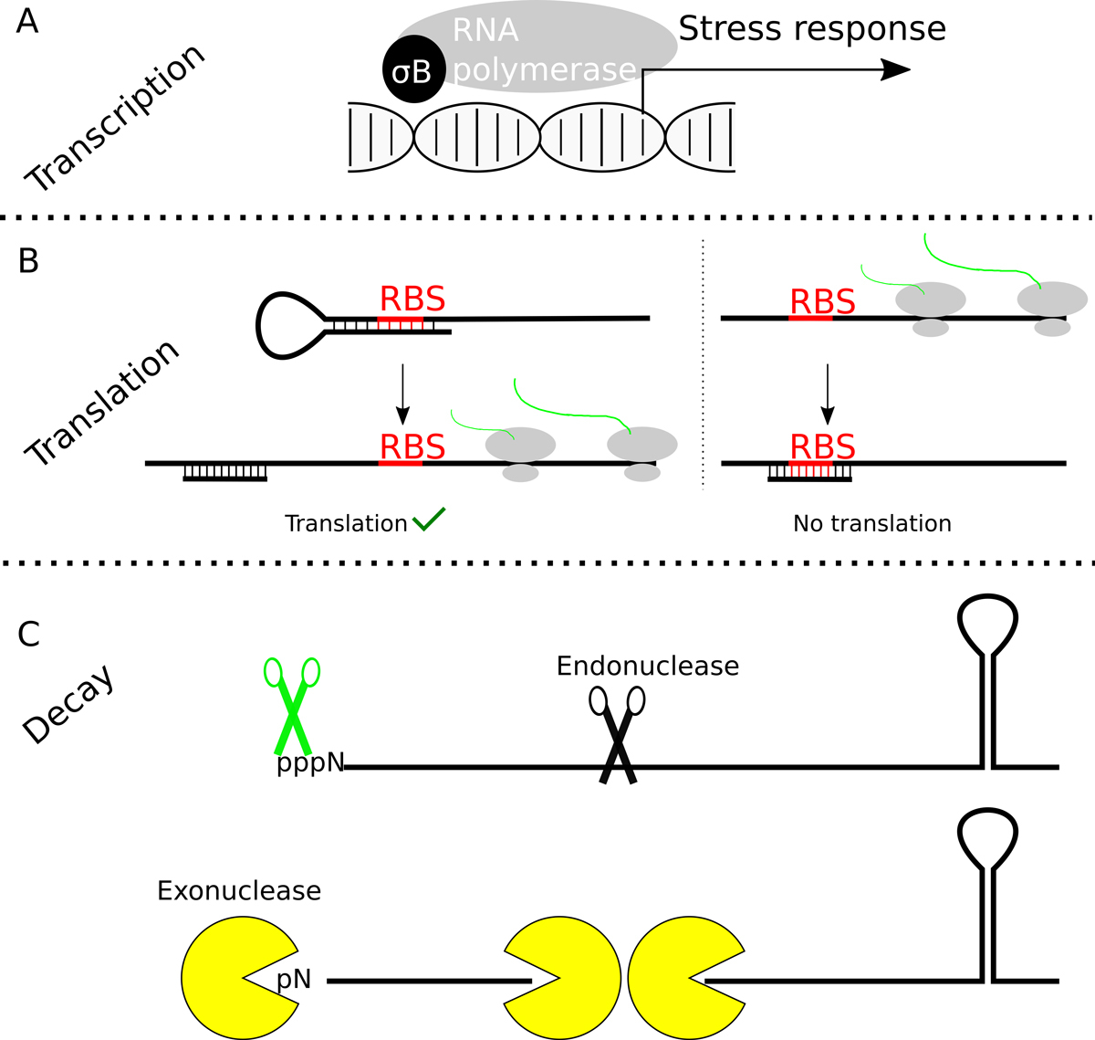 Figure 2 RNA synthesis, translation, processing and degradation. Gene expression can be regulated at many different levels. (A) Sigma factors direct the RNA polymerase to a subset of promoters and in the case of σB, the RNA polymerase will recognise promoters of stress response genes and operons. (B) To initiate translation, the small ribosomal subunit needs to recognise the RNA binding site by complementarity with its 16S rRNA. If the ribosome-binding site is trapped in a secondary structure or anneals with a sRNA, denaturation of the duplex will allow ribosome binding and translation (B, left). In some cases the RBS is normally accessible, but can be blocked by the synthesis and annealing of a sRNA (C, B, right). Several variations of these two possibilities are found in many bacteria. (C) To regulate gene expression the level of mRNAs may need to be carefully regulated. Dedicated enzymes, such endo – and exonucleases are involved in the processing and degradation of the RNAs. Additional enzymes, such as pyrophosphohydrolases (depicted as green scissors in the figure) or RNA helicases are required to render the RNA accessible for degradation, since triphosphorylated 5′ ends or secondary structures inhibit the exonucleases, respectively.