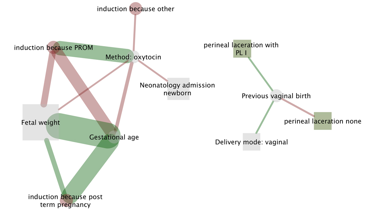 Figure 2 All significant and multiple correlations in the cohort. (Induction method catheter and oxytocin after caesarean section; for details see table 3 – clinically significant correlations and table S1 – clinically not relevant correlations). Each edge represents a statistically significant relationship between multiple variables. Positive correlations are indicated by the colour green (for example, previous vaginal birth increases the likelihood of vaginal delivery and a first degree perineal tear). Negative correlations are indicated by the colour red (for example, previous vaginal birth decreases the likelihood of secondary CS and vaginal assisted delivery due to abnormal labour progression). Predictive variables (factors) are indicated with circles and outcome variables with squares (for example higher gestational age results in increased fetal weight and higher risk for secondary CS due to abnormal labour progression). The size of the squares reflects the overall significance. Finally, variables related to the same indication or outcome variable (each reason for induction or type of perineal laceration) have the same node colour.