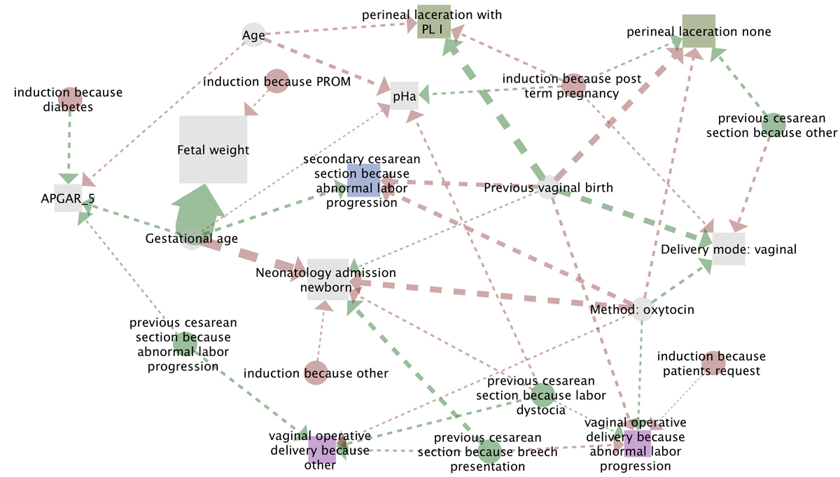 Figure 1 All significant one-to-one correlations in the cohorts (induction method catheter and oxytocin after caesarean section; for details see table 2 ). Each edge represents a statistically significant relationship between two variables. Positive correlations are indicated by the colour green (for example the gestational age correlates positively with the fetal weight: the more advanced the gestational age, the higher the fetal weight). Negative correlations are indicated by the colour red (for example, labour induction because of PROM is correlated to a lower birth weight). Predictive variables (factors) are indicated with circles and outcome variables with squares (for example induction because post-term pregnancy is a predictive factor for higher fetal weight). The size of the squares reflects the overall significance.