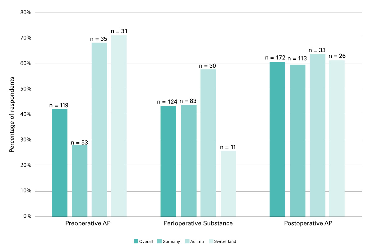 Figure 1 Nonadherence to the European Association of Urology (EAU) guidelines for pre-, peri- and postoperative antimicrobial prophylaxis (AP) in low-risk patients undergoing transurethral resection of the prostate; survey results (n = 286 urologists). Overall, 42% (119/286) of urologists routinely used preoperative antimicrobial prophylaxis, 43% (124/286) prescribed non-recommended perioperative prophylaxis agents, and 60% (172/286) routinely extended prophylaxis after surgery. In contrast to postoperative use, nonadherence rates for pre- and perioperative antimicrobial prophylaxis differed significantly between Germany, Austria and Switzerland (p = 0.853 vs p <0.001 and p = 0.007; chi-squared test).