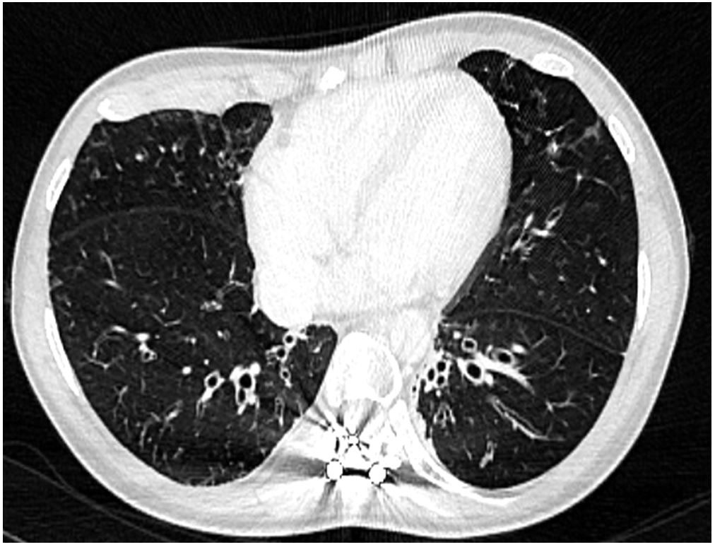 A 27-year-old female was referred to our department for management of an autoimmune haemolytic anaemia. Recent medical history included a diffuse large B-cell lymphoma at the age of 20 with negative Epstein-Barr virus (EBV) serology. She was considered in remission after four courses of rituximab, adriamycin, cyclophosphamide, vincristine, bleomycin, prednisone and intrathecal methotrexate, and consolidation with 2 infusions of methotrexate followed by successful autologous stem cell transplantation. During and after chemotherapy she had many bacterial infections and two episodes of herpes zoster reactivation. Examination of her childhood medical history found neonatal dwarfism and scoliosis with spinal osteosynthesis (fig. 1A), recurrent acute pulmonary and ear, nose and throat (ENT) infections with otitis media from the ages of 3 to 10 years, requiring placement of tympanostomy tubes at the age of 6 and adenoidectomy. The patient described frequent bronchitis and sinusitis requiring antibiotic courses two or three times a year, complicated by bronchiectasis (fig. 1B).