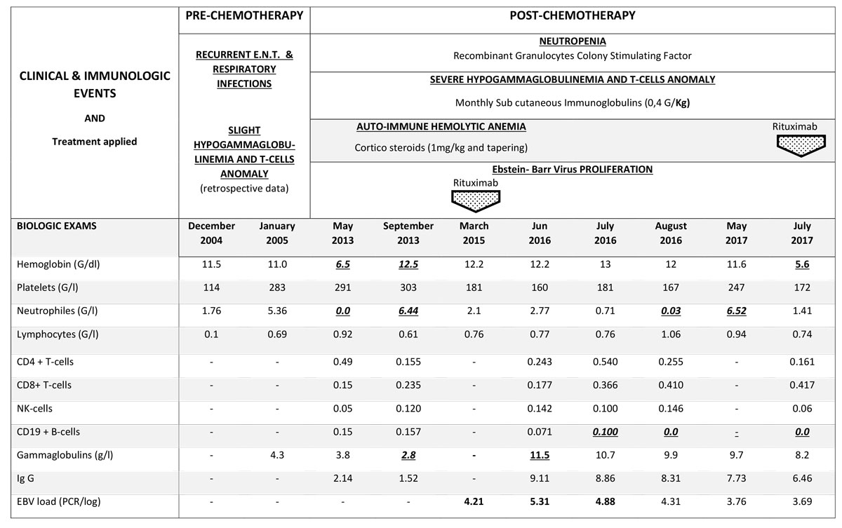 The clinical examination of the patient was unremarkable, except for short-limb dwarfism (height 130 cm, weight 42 kg), fine thin light hairs and mild hypermobility of large joints. Biological tests matched the criteria for autoimmune haemolytic anaemia, with positive Coombs tests for warm IgG and complement C3d marking, severe hypogammaglobulinaemia (2.0 g/l) and both B and CD4+ T cell lymphopenia. Retrospective measurement of gammaglobulin found that low levels (3.5–4 g/l) were present prior to chemotherapy. Figure 2 shows all previous and recent biological results. A low CD4 count of 209/mm3 was observed beginning at the age of 23 years (3 years after the chemotherapy), with a CD4/CD8 ratio greater than 1 and a normal total lymphocyte count. Monitored lymphocyte counts indicated a shift in the CD4/CD8 ratio to 0.6 and undetectable levels of CD19. Additionally, naïve T cells were undetectable, and the naïve B cell count was increased. On the basis of all the immunological findings, a primary immunodeficiency syndrome and a probable combined immunodeficiency syndrome were determined to have preceded the lymphoproliferative disease, and have been secondarily aggravated by chemotherapy. Finally, from the whole clinical picture, a diagnosis of cartilage hair hypoplasia, which is commonly associated with various immune dysfunction disorders, was made and confirmed with the identification of heterozygote mutation of the RMPR gene (substitutions 214 A>T, 230 C>T). The autoimmune haemolytic anaemia was then effectively treated with steroids as well as supportive intravenous immunoglobulin and oral prophylaxis with sulfamethoxazole-trimethoprim and valaciclovir.