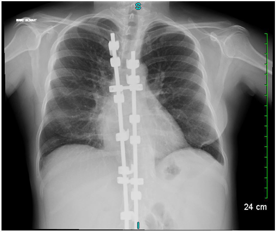 Figure 1 Chest X-ray showing scoliosis with spinal osteosynthesis and images of bronchiectasis.