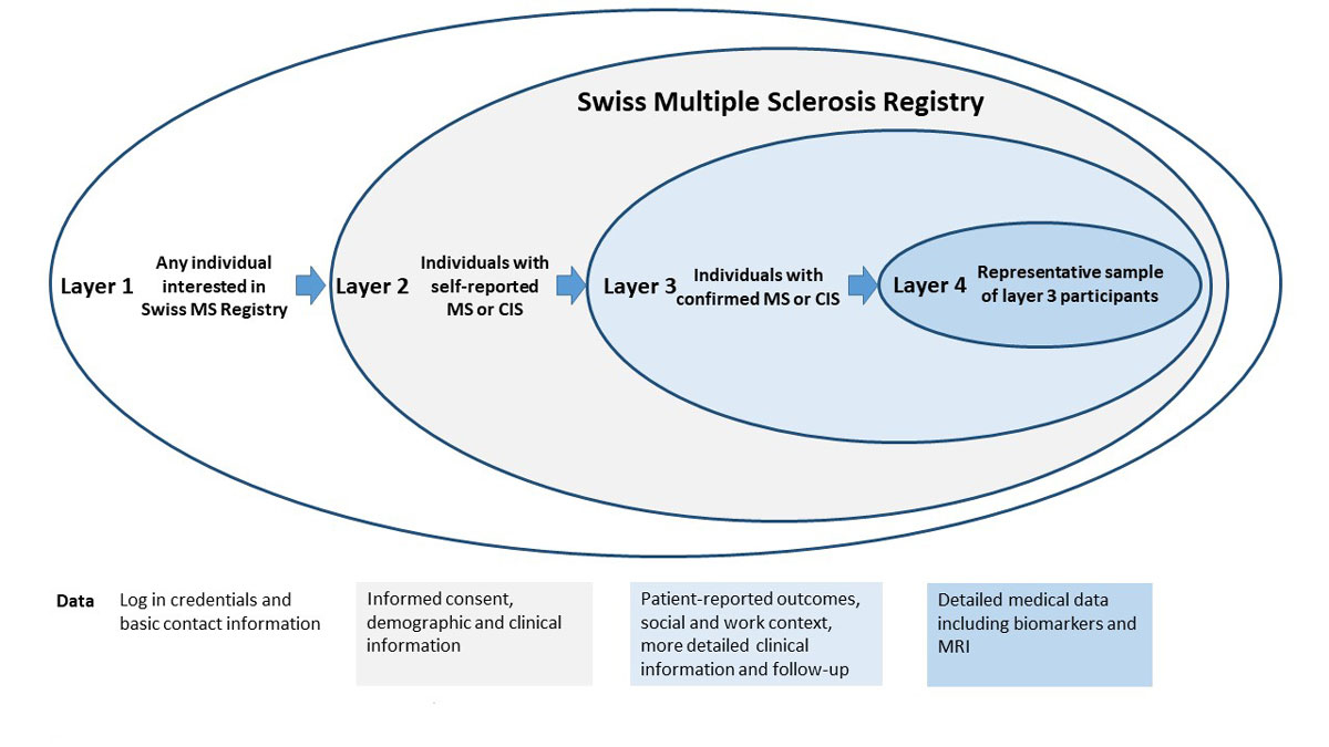 Figure 1 Layered model and type of data collection in the Swiss Multiple Sclerosis Registry.
