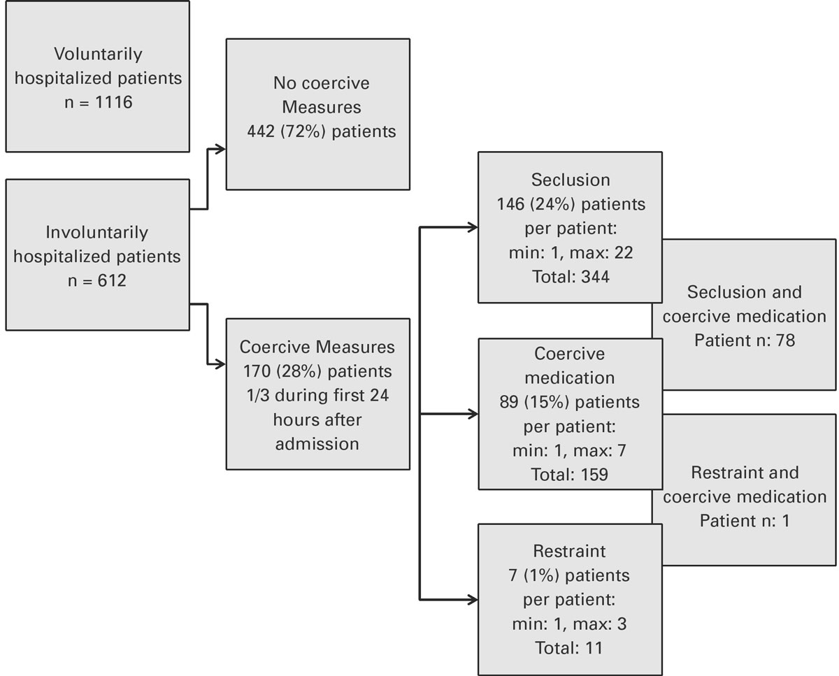 No exclusion criteria were defined. We screened a comprehensive cohort of all patients admitted to the University Hospital of Psychiatry Zurich during a six-month period from 1 January to 30 June 2016. Overall, 1728 inpatients were treated during this period. Of these patients, 577 (33%) were involuntarily and 1151 (67%) were voluntarily admitted. For the following analyses related to the occurrence of coercion, we included the 577 (33%) involuntarily admitted patients and 35 (2%) voluntarily admitted patients who were retained because of harm to themselves or others at a later stage during their hospitalisation, which led to a change of their legal status to involuntary hospitalisation. Thus, we conducted statistical analyses with a total of 612 (35%) patients.