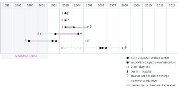 The figure illustrates how single inpatient care events are combined into inpatient treatment sequences of ovarian cancer patients. Exemplary patients illustrate some of the many possible treatment sequences: Patient 1 has only one hospital stay in 2003. This stay is coded with an ovarian cancer main diagnosis and the patient dies in hospital. Patient 2 is identical to patient 1 but is released alive. Patient 3 is first treated in 2003 with an ovarian cancer main diagnosis and then for a second time in 2004 with an ovarian cancer secondary diagnosis. In 2005 she is hospitalised with a diagnosis not related ovarian cancer and released alive. Patient 6 is hospitalised one time in 2003 and two times in 2004 with a non-ovarian cancer diagnosis. The first stay with ovarian cancer main diagnosis is recorded in 2006 and is followed by two more hospitalisations with ovarian cancer diagnosis. This patient is again hospitalised in 2008 with a non-ovarian cancer diagnosis is released alive.