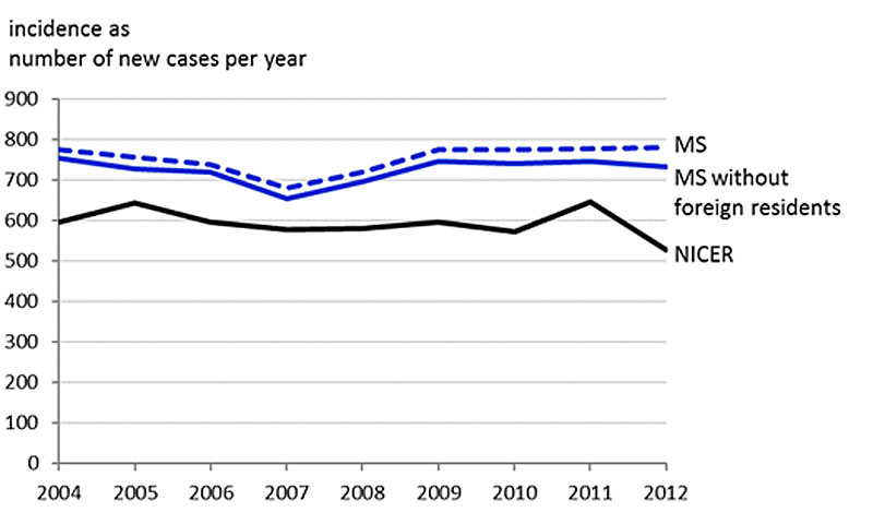 Figure S2 Incidence as number of new cases per year (2004-2012). The figure illustrates the number of new ovarian cancer cases per year. The blue lines show the incidence of new cases calculated with MS, while the dark line is the incidence of new cases found by NICER.