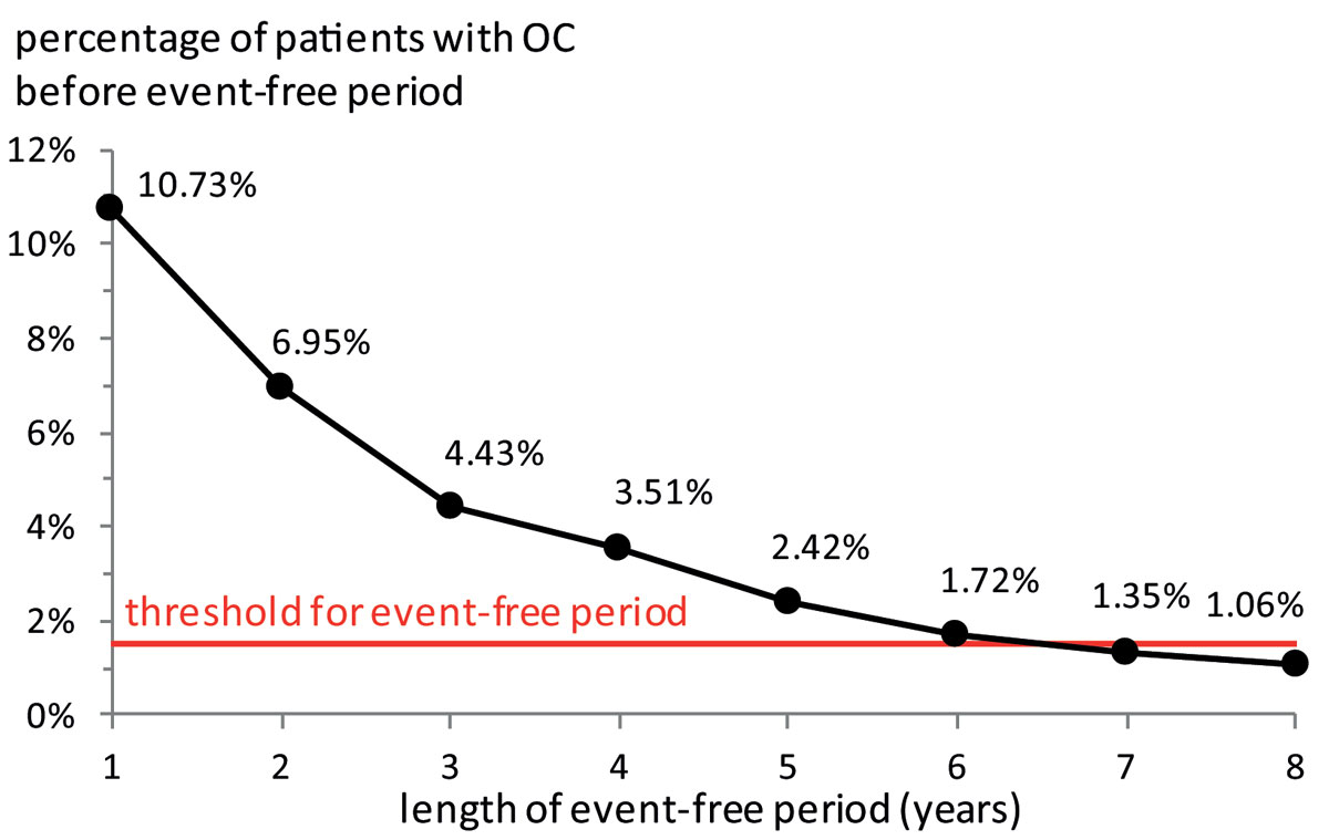 Figure 1 Length of event-free period and the percentage of patients with ovarian cancer before event-free period. The figure shows the percentage of patients with ovarian cancer (OC) before event-free periods of different lengths. The longer the event-free period, the lower the percentage of patients identified with ovarian cancer before the event-free period.