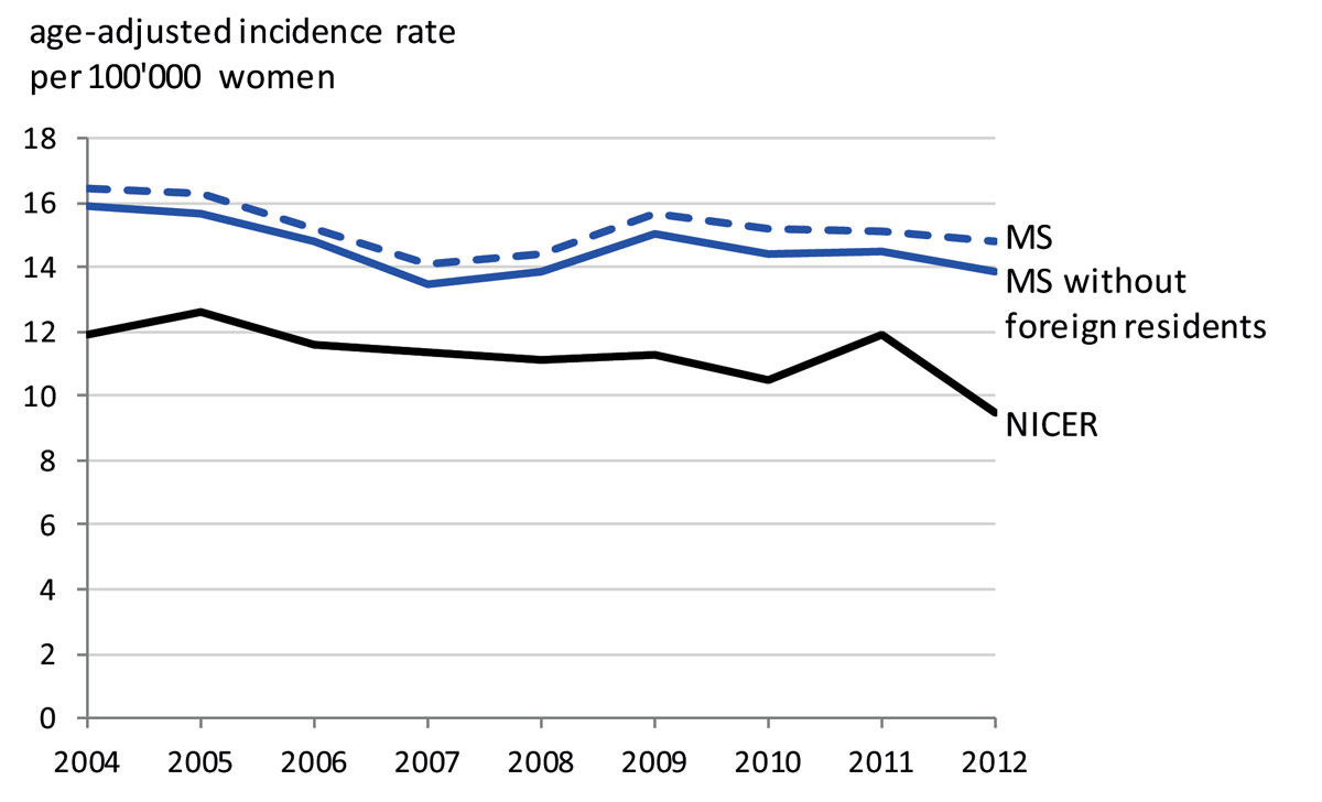 Although our estimate of the ovarian cancer incidence rate is substantially higher than the previous estimate for Switzerland, it is within the range of rates reported for other countries. According to EUCAN [16], the ovarian cancer incidence rates in large European countries varied from 16.0 in the UK to 13.3 in Italy, 10.7 in France and 10.2 in Germany in 2012. The highest rate reported in Europe was 18.9 for Latvia, and the lowest was 4.2 for Albania. Our results indicate that part of these differences in incidence rates may be due to differences in the underlying data sources. The reasons for these substantial differences should be carefully explored. A case-wise comparison could, for example, detect whether the difference is due to over- or under-reporting in one of the two registries.