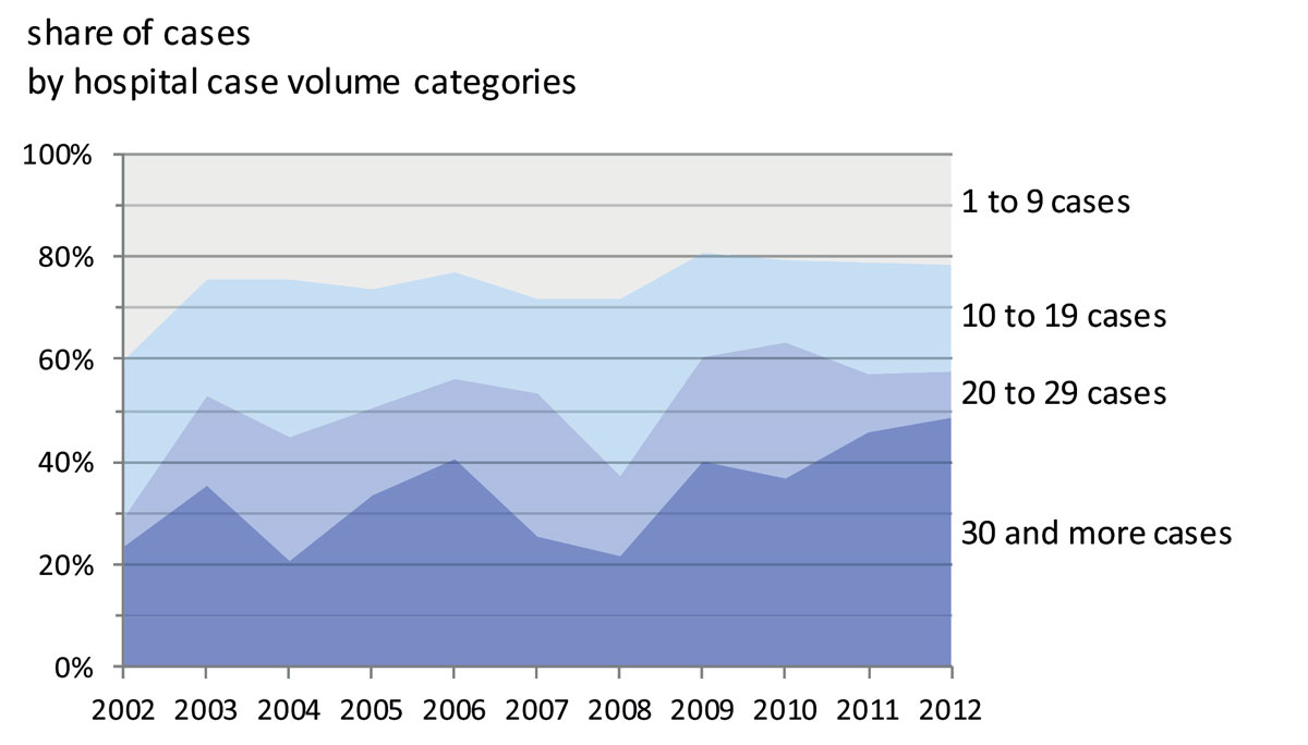 Figure 4 Share in yearly case volume by hospital case volume category. The figure shows the share of each hospital volume category and its evolution over time.