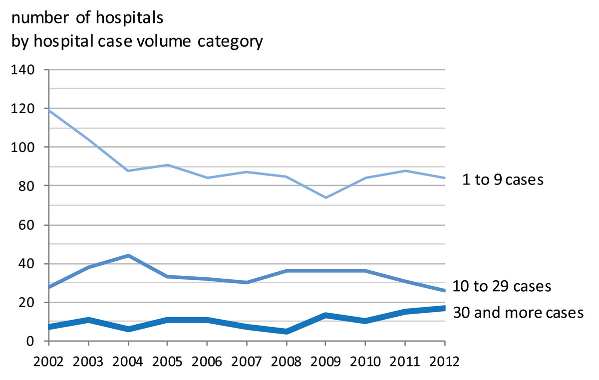 Ovarian cancer hospital patient volume was low in most Swiss hospitals, with over 80 institutions treating fewer than 10 patients per year in 2012. Therefore, up to 2012, most ovarian cancer patients were treated in hospitals with a case volume of less than 30 ovarian cancer patients per year despite the growing evidence that this leads to poorer outcomes (fig. 3).