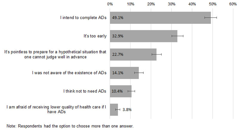 Figure 3 Reasons for not having completed an advance directive (AD), adults aged 55+ in Switzerland, weighted percentage and 95% confidence intervals, SHARE 2015.