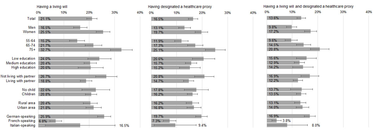 Figure 1 presents completion rates of different types of advance directives by sociodemographic characteristics. Levels of completion of living wills by sociodemographic characteristics were slightly higher than completion levels of the two other forms of advance directive, i.e., having designated a healthcare proxy or having both a living will and a healthcare proxy. However, the sociodemographic differences of the groups having completed a living will, having appointed a healthcare proxy or having done both were very similar. Levels of living will completion were lower among men (16.5%), among respondents aged 55 to 64 years (15.2%), and among individuals living with a partner (18.8%). Furthermore, 6.8% of people living in the French-speaking part of Switzerland had completed a living will, compared with 25.9% in German-speaking Switzerland.
