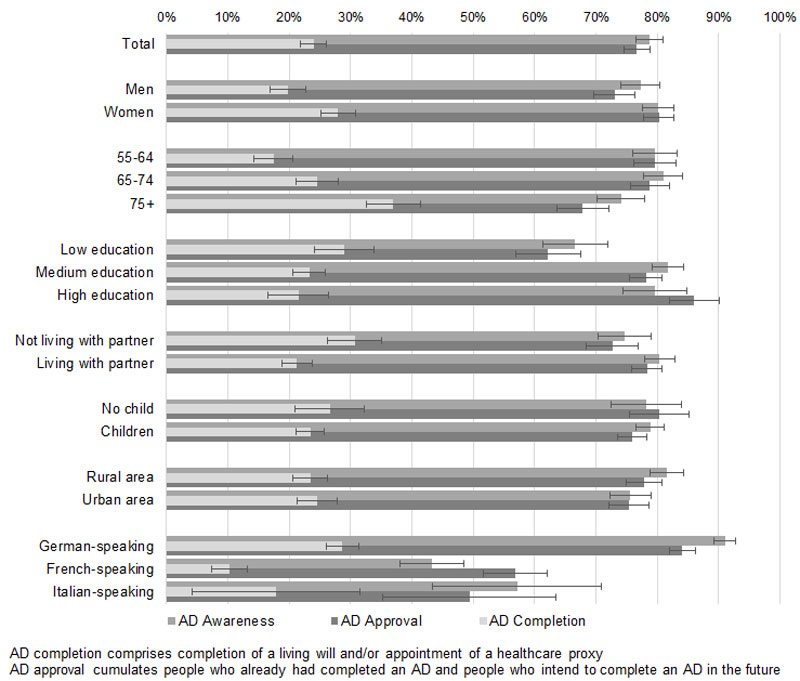 Figure 2 Awareness, approval and completion of advance directives (ADs) by sociodemographic characteristics, adults aged 55+ in Switzerland, weighted percentage and 95% confidence intervals, SHARE 2015.