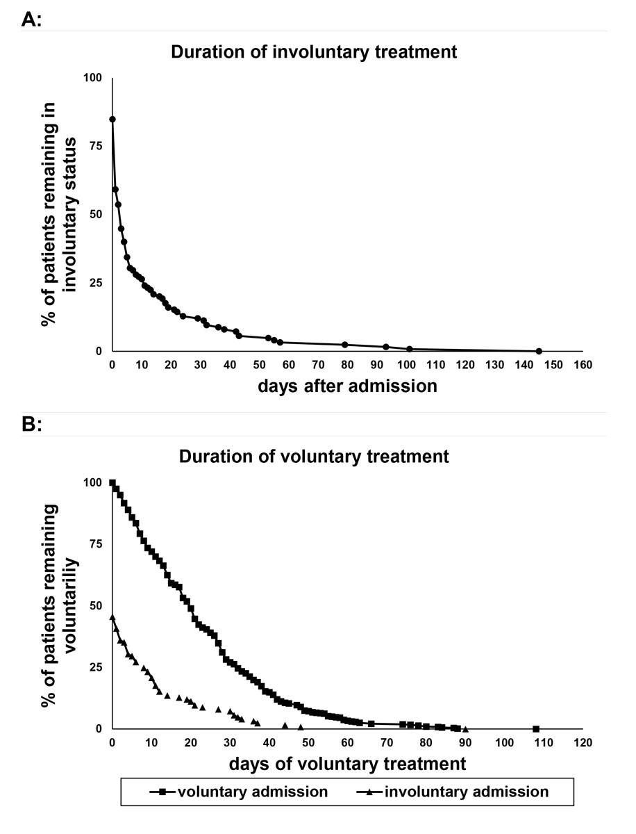 Figure 1 A: Duration of the involuntary treatment status for the involuntarily admitted patients. B: Duration of voluntary treatment for voluntarily and involuntarily admitted patients. In the latter subgroup only the days after release of the involuntary status are displayed.