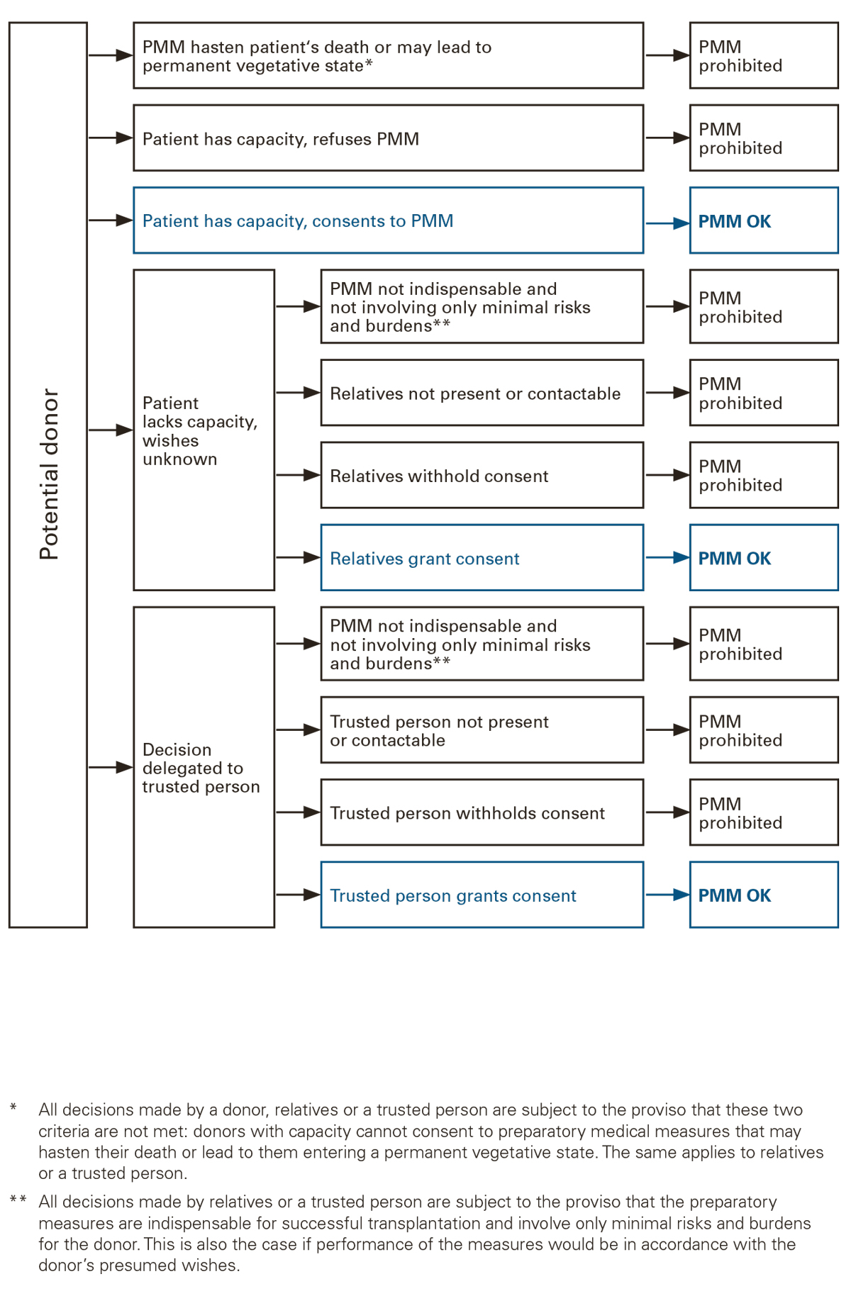 Preparatory medical measures may be performed if consent has been granted by the person concerned. Measures that hasten death or may lead to a permanent vegetative state are not permitted.