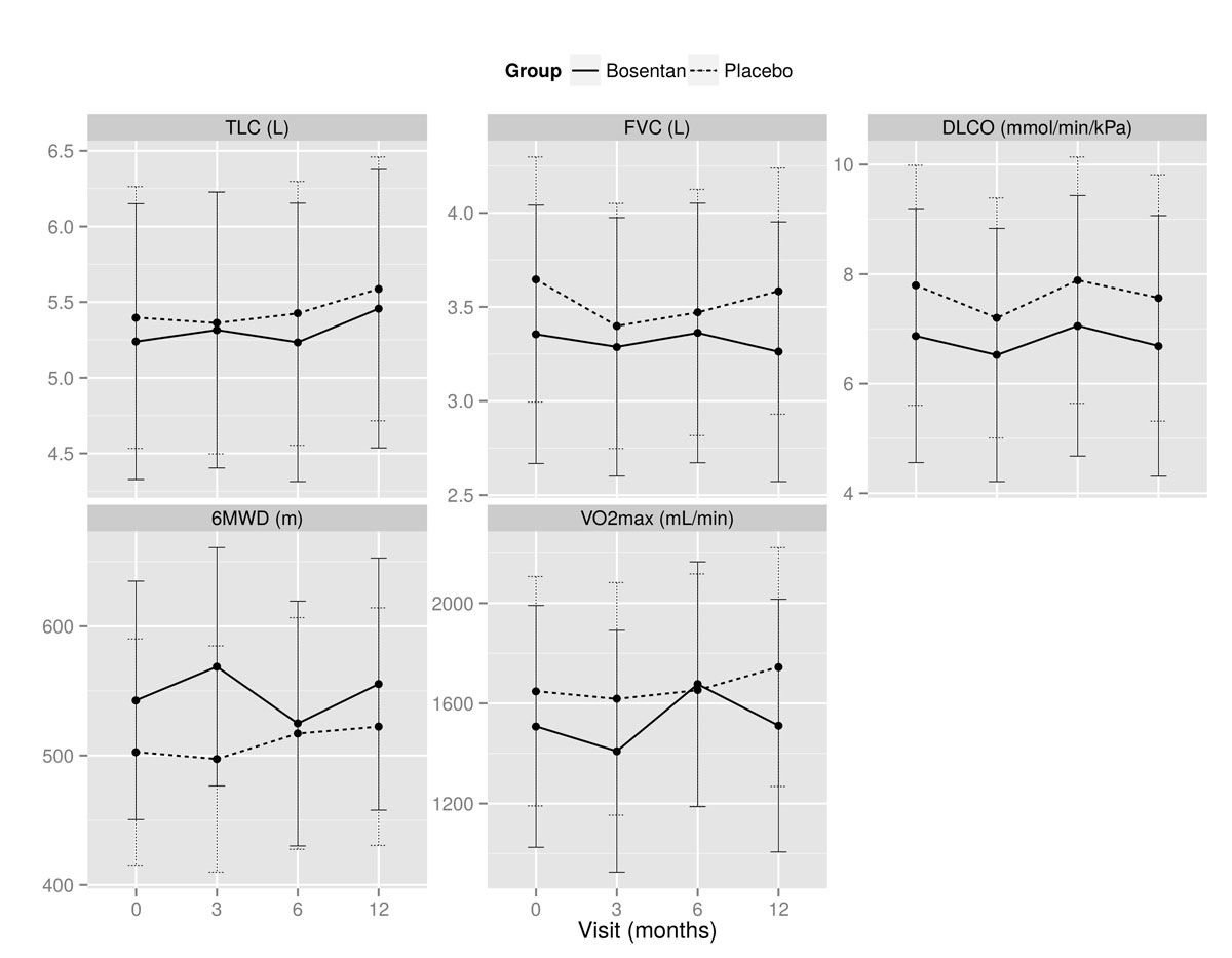 Mean absolute values of TLC, FVC, DLCO, 6MWD, and VO2max at baseline, and months 3, 6 and 12 are shown in fig. 2. There was no statistically significant change for any of the primary endpoints (table 2). In addition, no statistically significant between-group differences were found (table 2). Figure 3 depicts the percent change of mean absolute values from baseline to month 12, and figure 4 demonstrates absolute values of TLC, FVC, DLCO, 6MWD and VO2max for all individuals at baseline, and at months 3, 6 and 12. There was no statistically significant change of FVC over time (decrease or increase) in either the bosentan group or the placebo group, with also no significant interaction. Five out of eight patients (63%) treated with bosentan showed an increase of 10% in at least one of the primary endpoints, compared with six out of nine (67%) in the placebo group (p = 1).