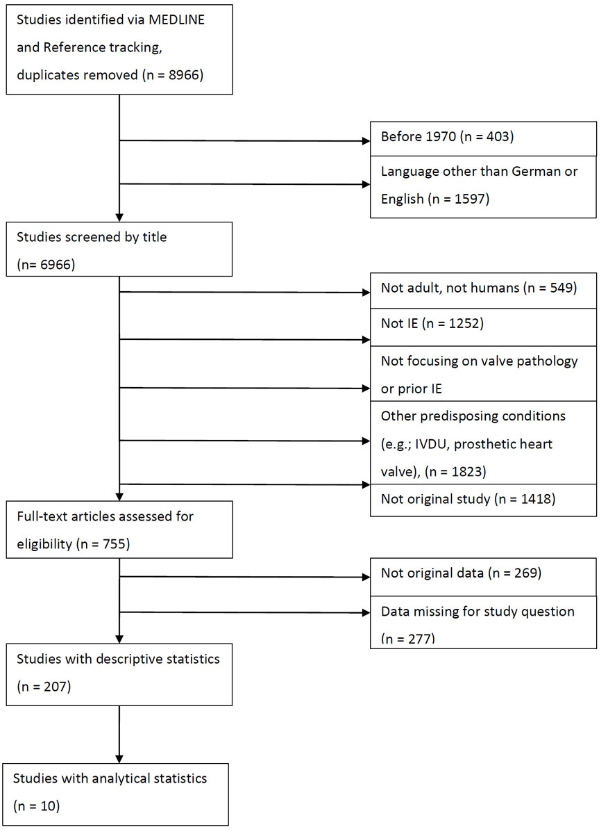 Heart valve conditions considered relevant for this study were prior endocarditis, aortic valve stenosis or insufficiency, bicuspid aortic valve, mitral valve stenosis or insufficiency, mitral valve prolapse, pulmonary valve insufficiency or stenosis, and tricuspid valve insufficiency or stenosis. Original articles in English or German published from 1 January 1970 to 31 July 31 2015 were screened for eligibility. Articles published after 1970 were included because von Reyn et al. [9] published criteria on the basis of infective endocarditis cases that were treated between 1970 and 1977. If the article did not concern adult humans or concerned diseases other than endocarditis, it was excluded. Case reports, letters and review articles were excluded.