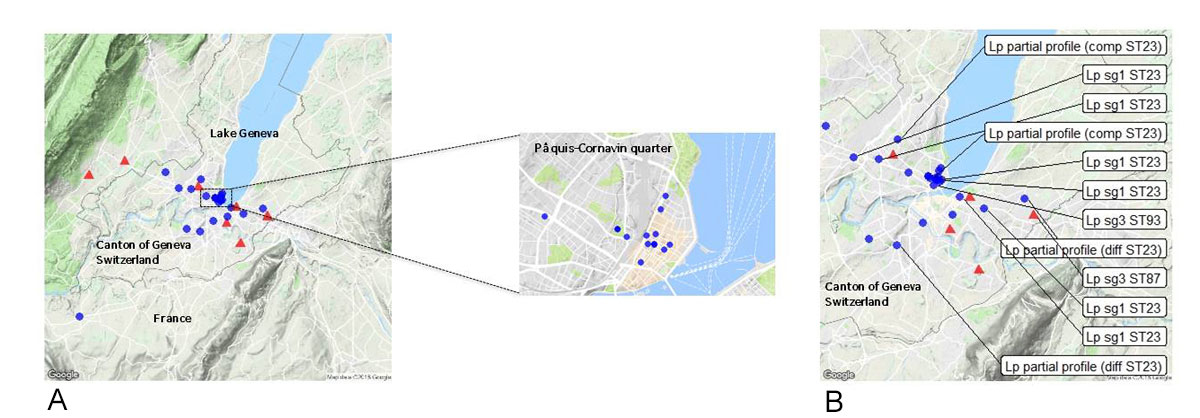 Figure 2 A: Mapping of confirmed cases of Legionnaires’ disease by place of residence, Geneva, Switzerland June-September 2017. Dots: patients linked to the highly affected Pâquis-Cornavin area. Triangles: patients having no link with the Pâquis-Cornavin area. To ensure better visibility, three cases are not represented in the zoomed-out map of Geneva. B: Mapping of the L. pneumophila (Lp) subtypes of 12 clinical samples. Dots: patients linked to the highly affected Pâquis-Cornavin area. Triangles: patients having no link with the Pâquis-Cornavin area. comp: compatible with; diff: different from.
