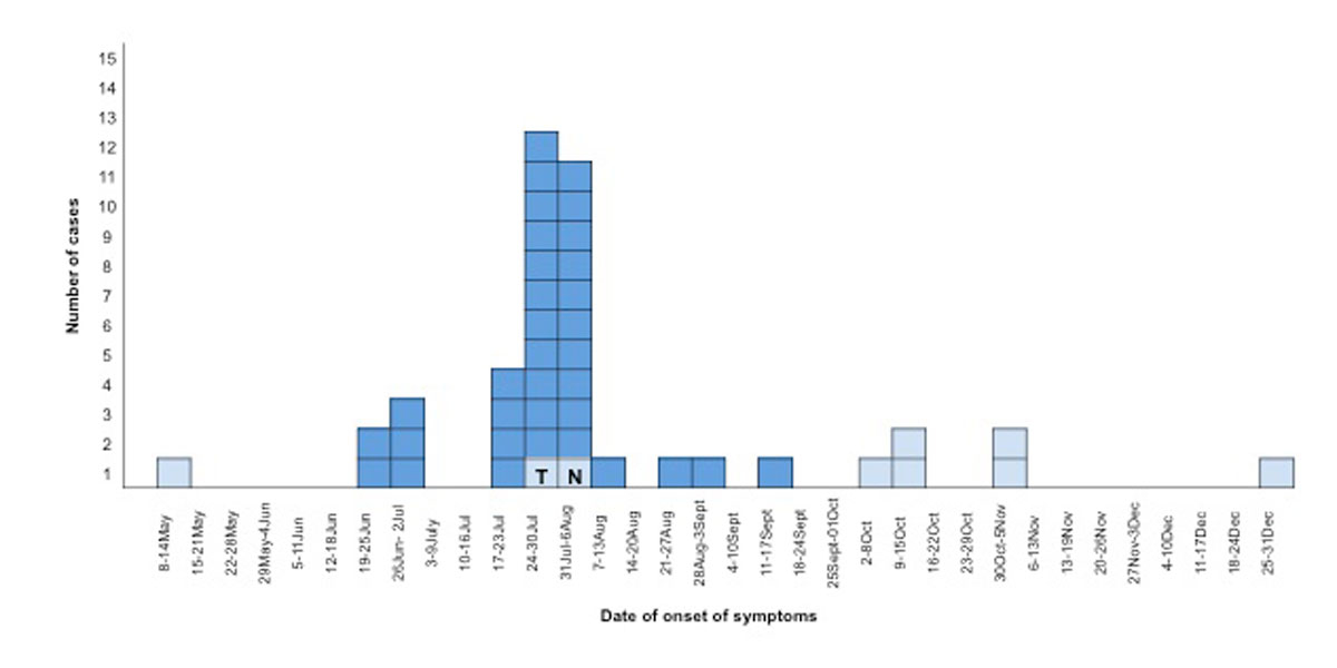 Figure 1 Number of confirmed Legionnaires’ disease cases by date of onset of symptoms, Geneva, Switzerland, May-December 2017. Dark blue squares: cases attributed to the outbreak. Light blue squares: cases not attributed to the outbreak. N: possible nosocomial case. T: travel-associated case.