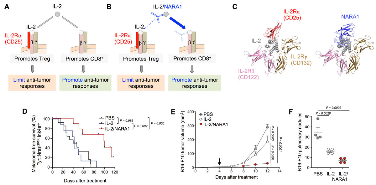 Figure 1 IL-2 complexes stimulate potent antitumour CD8+ T cell responses. (A–B) IL-2 activates CD25high CD4+ Treg and CD122high CD8+ T cells, whereas CD122-biased IL-2 complexes (such as IL-2/NARA1 complexes) preferentially stimulate CD122high CD8+ T cells. (C) NARA1 binds with 10-fold higher affinity than CD25 to the CD25 epitope of IL-2. (D–F) IL-2/NARA1 complexes elicit potent antitumour responses in Tyr::N-RasQ61K Ink4a–/– mice (that spontaneously develop melanoma; ref [29]) (D) as well as in the cutaneous (E) and pulmonary B16F10 mouse melanoma models (F). Adapted from refs [12, 21].