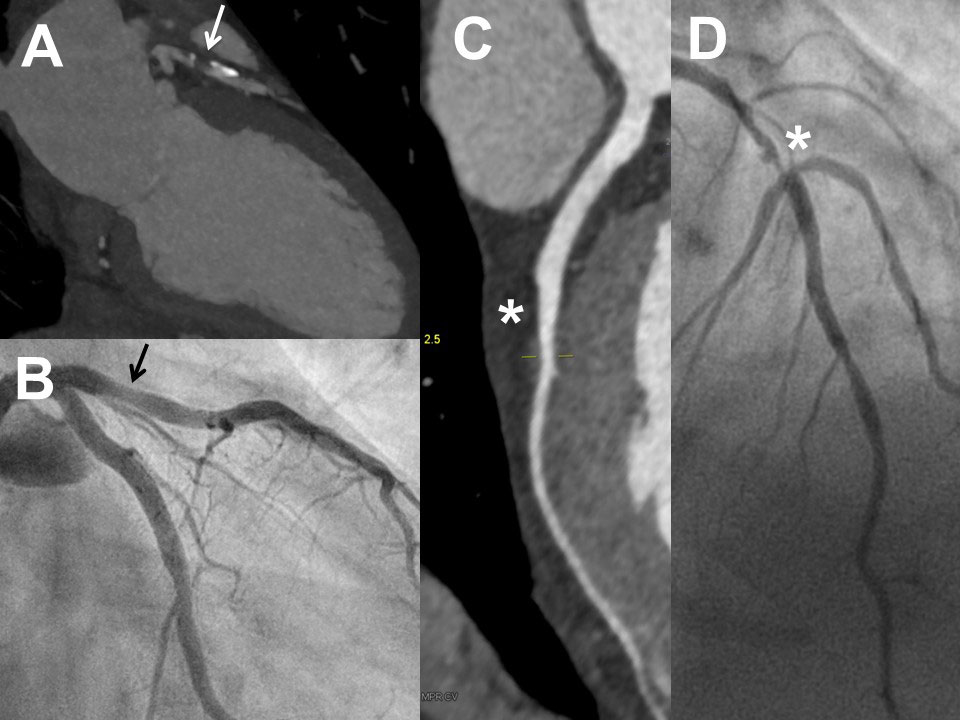 Figure 3 Examples of coronary computed tomography (CCTA) and invasive coronary angiography (ICA) in two patients with non-optimal correlation of the two methods: Frist patient (female, 54 years) with severe stenosis of the proximal left anterior descending artery in CCTA (panel A, arrow) but eccentric plaque without significant stenosis in ICA (panel B, arrow; lesion looking less relevant in other projections, absolutely normal fractional flow reserve). Second patient (female, 61 years) with no significant stenosis of the mid left anterior descending artery in CCTA (panel C, asterisk) but severe stenosis of the mid left anterior descending artery in ICA (panel D, asterisk).