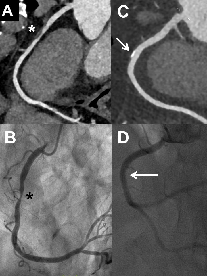 Figure 2 Examples of coronary computed tomography (CCTA) and invasive coronary angiography (ICA) in two patients with excellent correlation of the two methods: First patient (male, 62 years) with severe stenosis in the mid right coronary artery in CCTA (panel A, asterisk) and ICA (panel B, asterisk). Second patient (male, 58 years) with plaque (no relevant stenosis) in the mid right coronary artery in CCTA (panel C, arrow) and ICA (panel D, arrow).