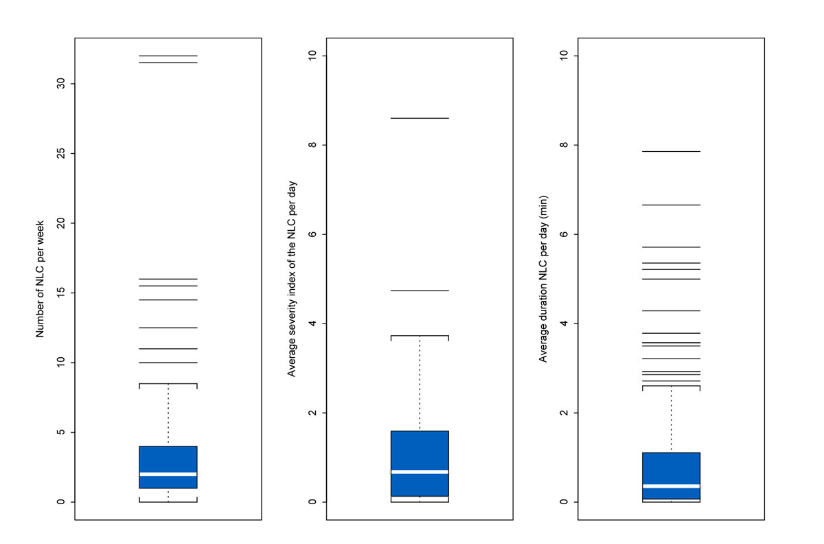 Figure 1 Number of nocturnal leg cramps (NLC) per week, average severity index per day, and average duration in minutes per day per patient (n = 129).