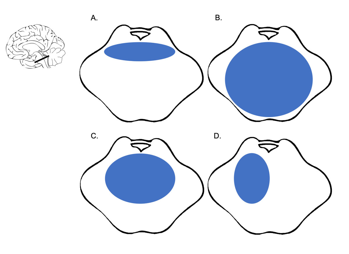Figure 3 A-D show an axial view of the pontine part of the Brainstem. A. shows a “basal tegmental” haemorrhage, B. a “massive” haemorrhage, C. “bilateral tegmental” haemorrhage and D. “unilateral tegmental” haemorrhage. “Massive” brainstem haemorrhages have the poorest and “unilateral tegmental” the best clinical prognoses according to our literature review.