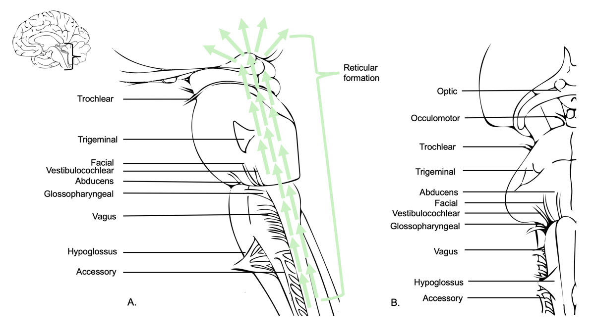 Figure 5 The brainstem contains the nuclei of the cranial nerves III–XII and is therefore responsible for the sensory, motor and autonomic innervation of the head and neck. The vagus nerve also arises from the brainstem and gives rise to other autonomic fibres (not limited to the head and neck). Some nuclei of the reticular formation are vital centres as they regulate cardiac and respiratory activities. Others are essential for cerebral arousal and maintenance of consciousness or are highly involved in the regulation of muscle tone, posture and reflex activities. A. shows sagittal view of the brainstem, the cranial nerves III–XII and the reticular formation. B. shows the ventral view (right side) of the brainstem.