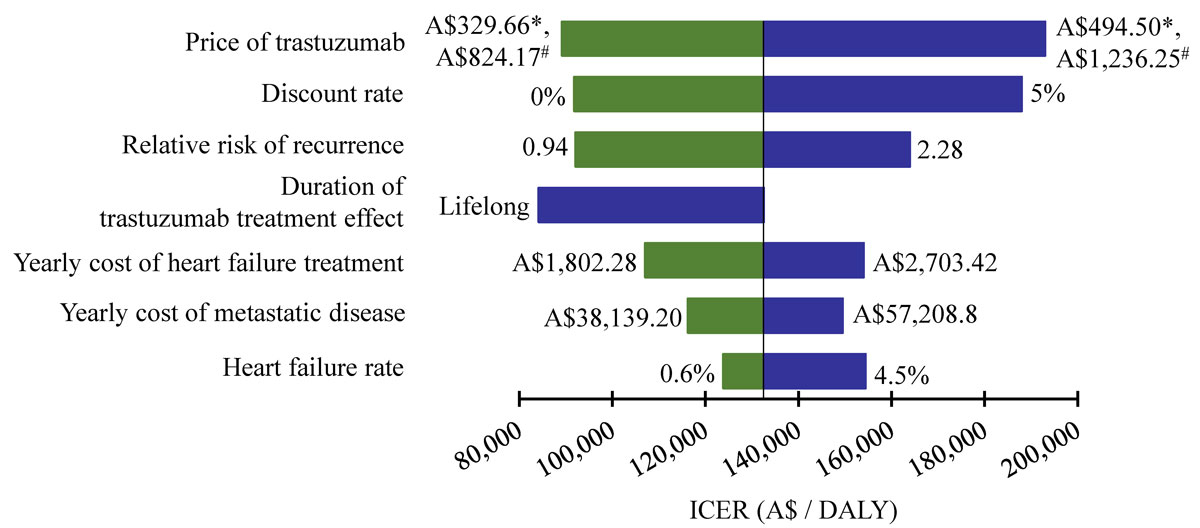 Univariate sensitivity analysis of key parameters is illustrated as a tornado diagram (fig. 5). Results were most sensitive to changes in the price of trastuzumab and discount rate. A 20% reduction in the price of trastuzumab would result in a 33% decrease in ICER (reducing from A$132,537 at baseline to A$89,172 per DALY averted). At a discount rate of 0%, the ICER reduced to A$91,768, compared with A$132,547 per DALY averted at baseline. Results were most robust to variations in cost of heart failure treatment, cost of metastatic disease and heart failure rate. None of the changes explored in the sensitivity analysis yielded an ICER of less than A$50,000 per DALY.