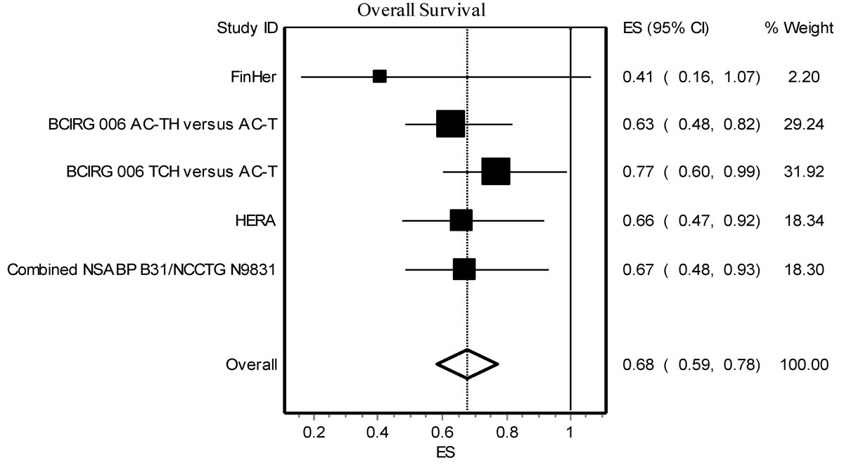 Figure 1 A meta-analysis of trastuzumab efficacy in early breast cancer (relative risk for death). AC-T, doxorubicin and cyclophosphamide followed by docetaxel alone (control); AC-TH, doxorubicin and cyclophosphamide followed by 1 year trastuzumab plus docetaxel chemotherapy; BCIRG 006, Breast Cancer International Research Group study 006 [18];CI, confidence interval; ES, effect size; FinHer, Finland Herceptin [19]; HERA, Herceptin Adjuvant study [8]; NCCTG N9831, North Central Cancer Treatment Group study N9831 [5, 7, 17]; NSABP B31, National Surgical Adjuvant Breast and Bowel Project study B31 [5, 7, 17]; TCH, docetaxel and carboplatin plus 1 year trastuzumab.