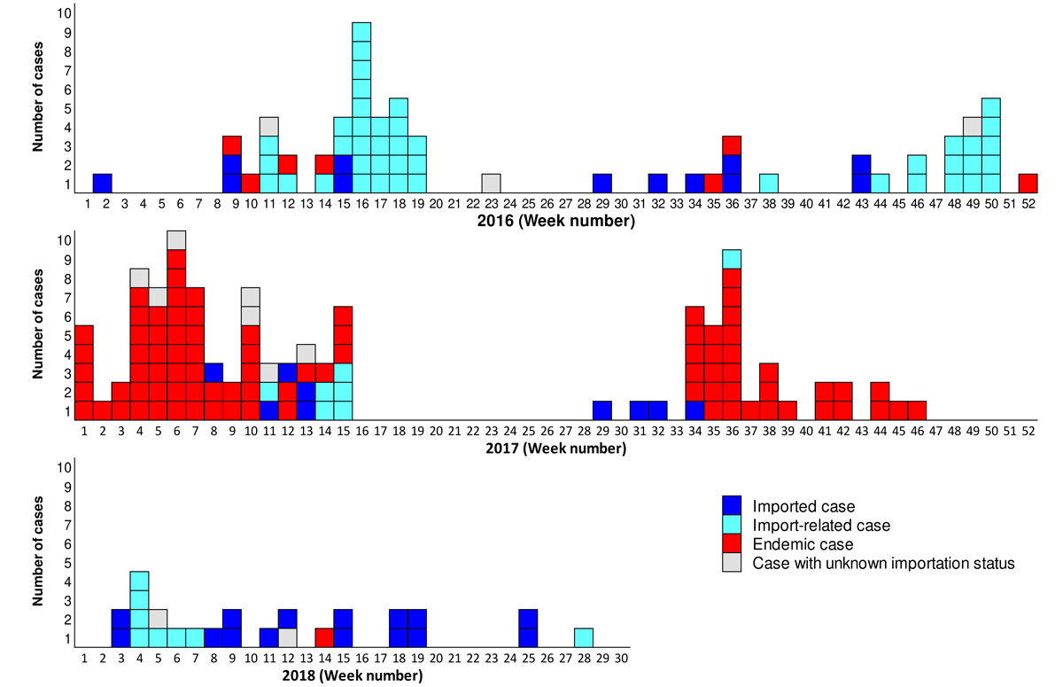 The epidemic curve from January 2016 to July 2018 illustrates the variability in importation status and in the recent temporal distribution of measles cases (fig. 5). We also noted several periods with no cases, the longest of which lasted 13 weeks, which is three to four times the maximum incubation period. Moreover, only imported cases were recorded during the five subsequent weeks.